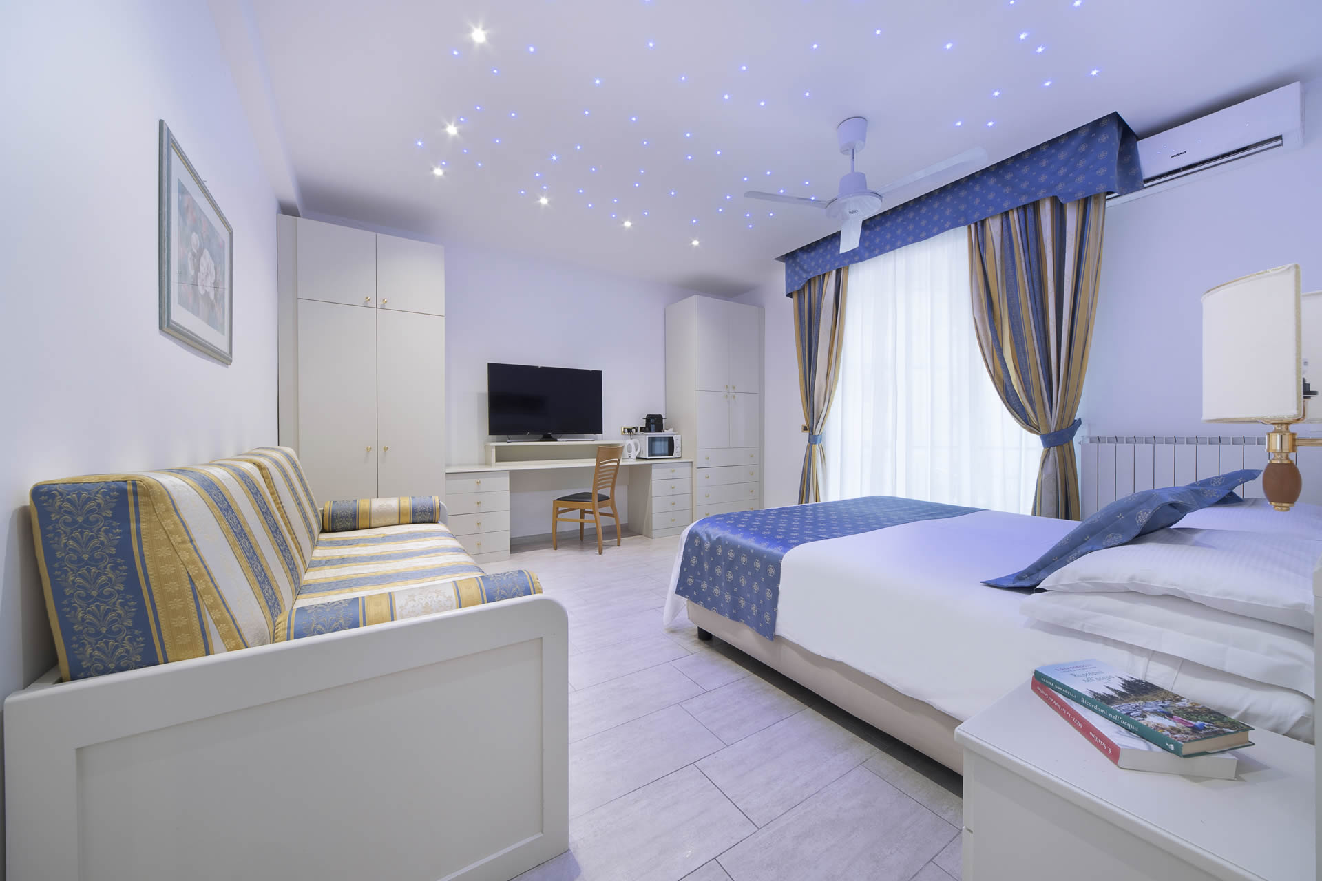 Bilocale senza cucina con soggiorno con finestra, divano in pelle che si può aprire a letto matrimoniale con tv led; appartamento con doppi servizi, camera da letto con letto matrimoniale e divano con balcone e tv led con decoder di sky.