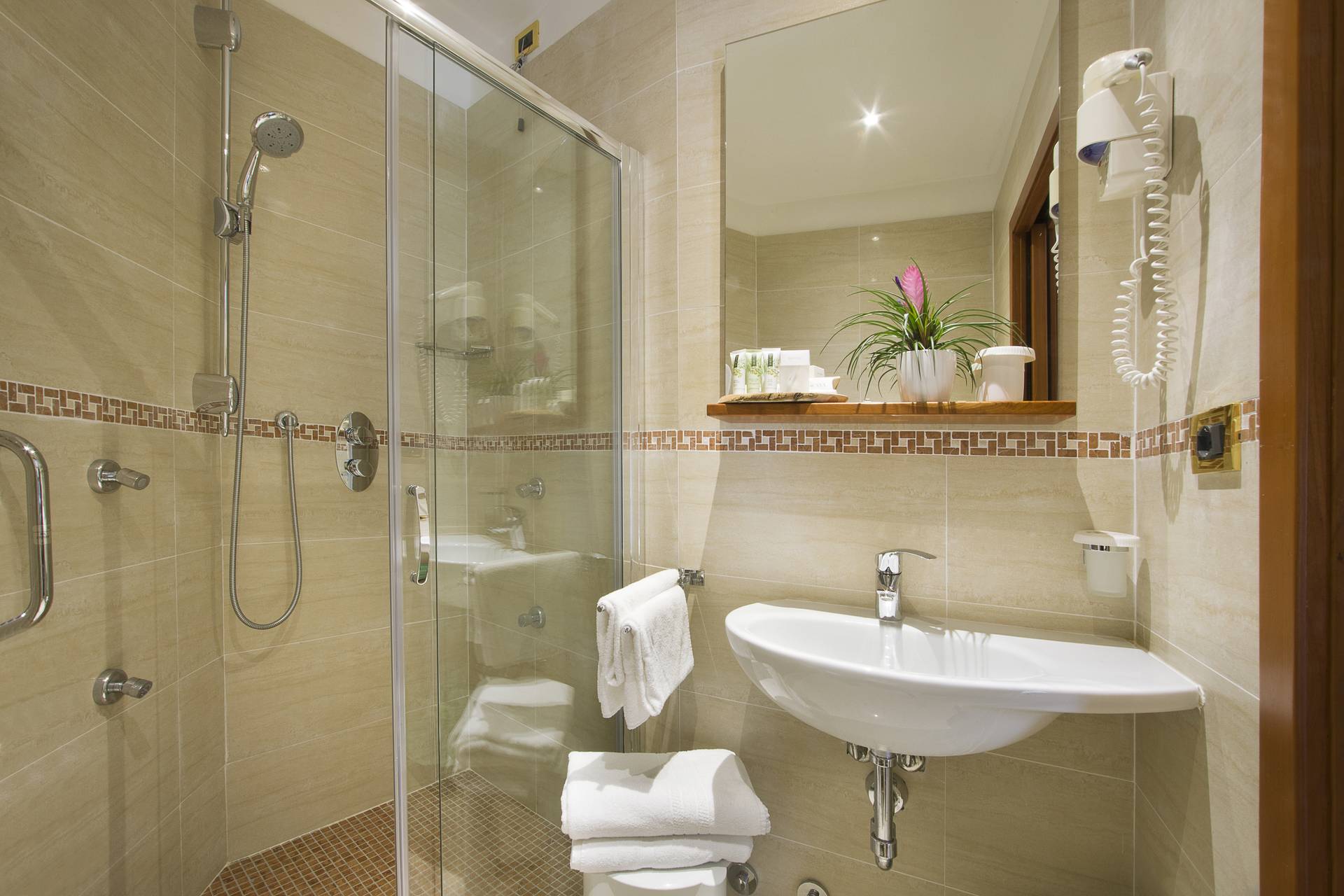 Servizi e comfort: aria condizionata caldo/freddo regolabile, termosifoni, ventilatore a soffitto, minifrigo, TV LCD/LED con TV-Sat e SKY, telefono, bagno privato con doccia, asciugacapelli, cassaforte, Wi-Fi e ADSL gratuiti.