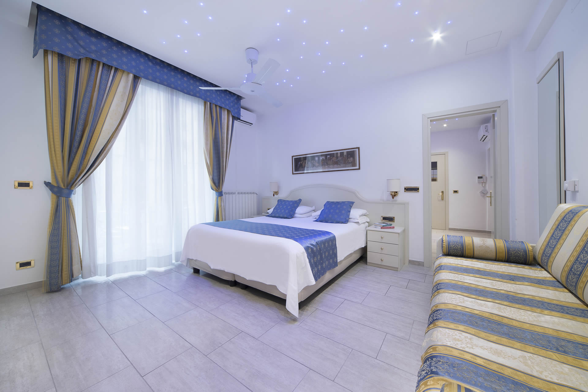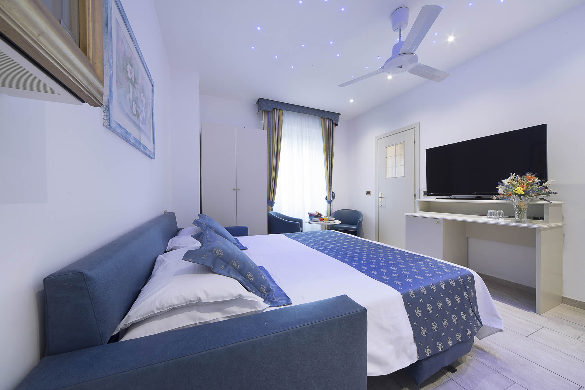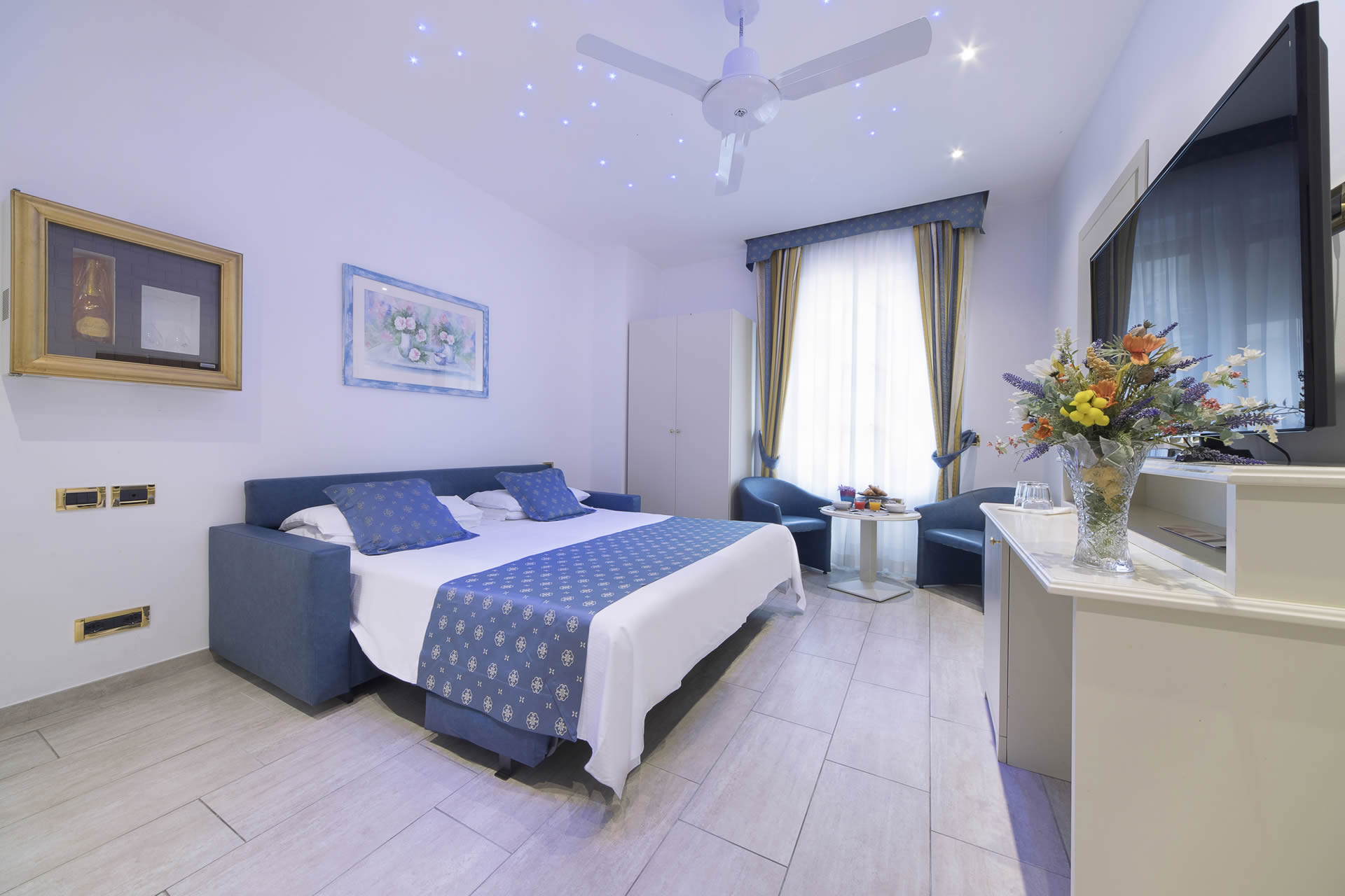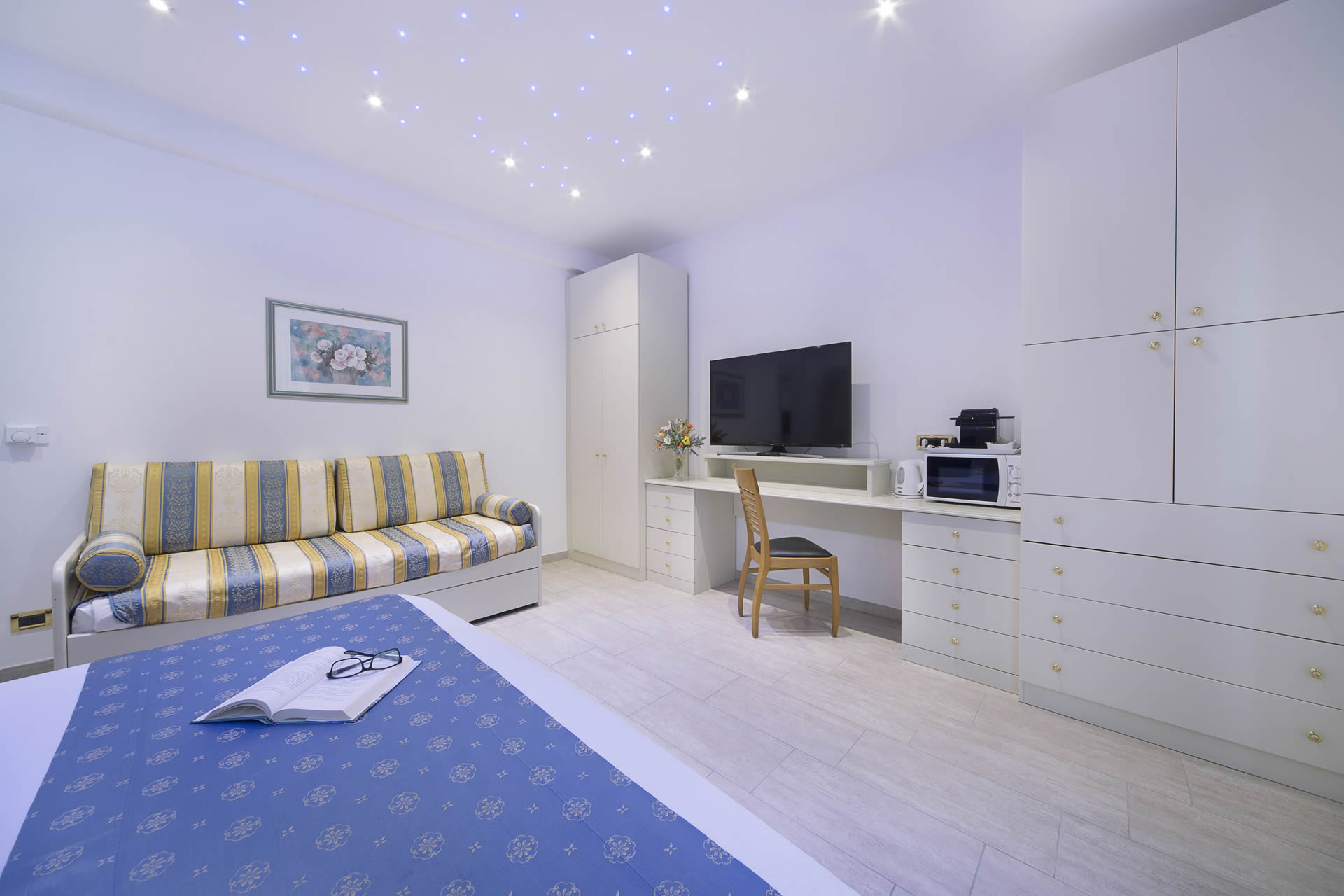 Bilocale senza cucina con soggiorno con finestra, divano in pelle che si può aprire a letto matrimoniale con tv led; appartamento con doppi servizi, camera da letto con letto matrimoniale e divano con balcone e tv led con decoder di sky.