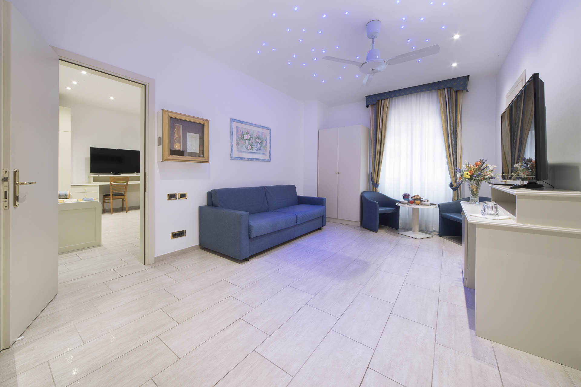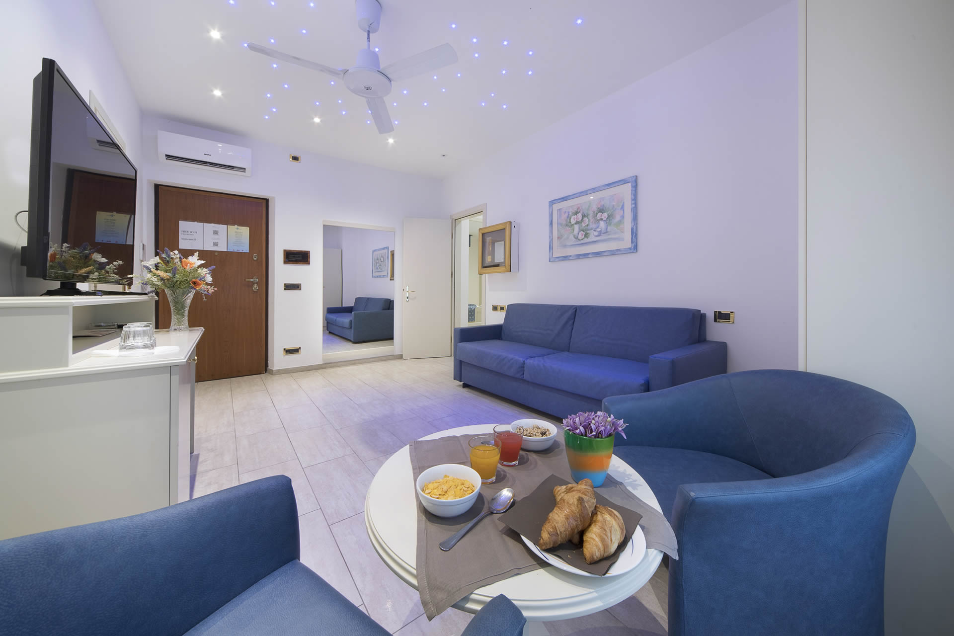 Appartamento situato al 2° piano, con ascensore, nel condominio adiacente alla nostra reception e anche con collegamento interno all'hotel.