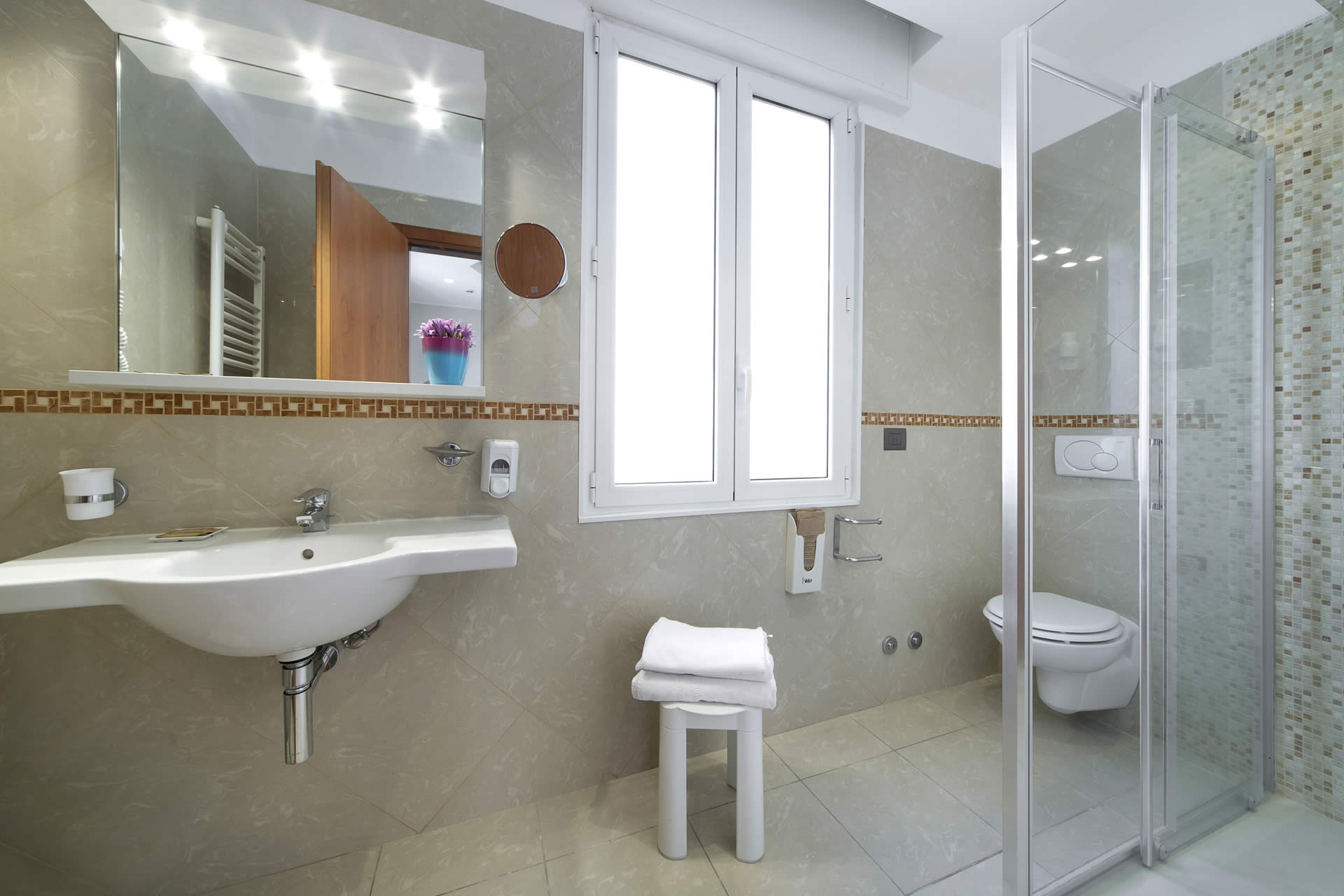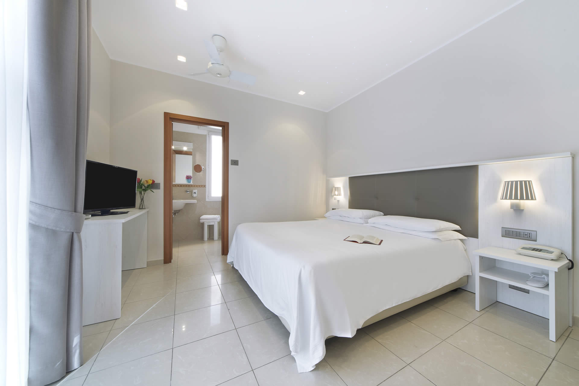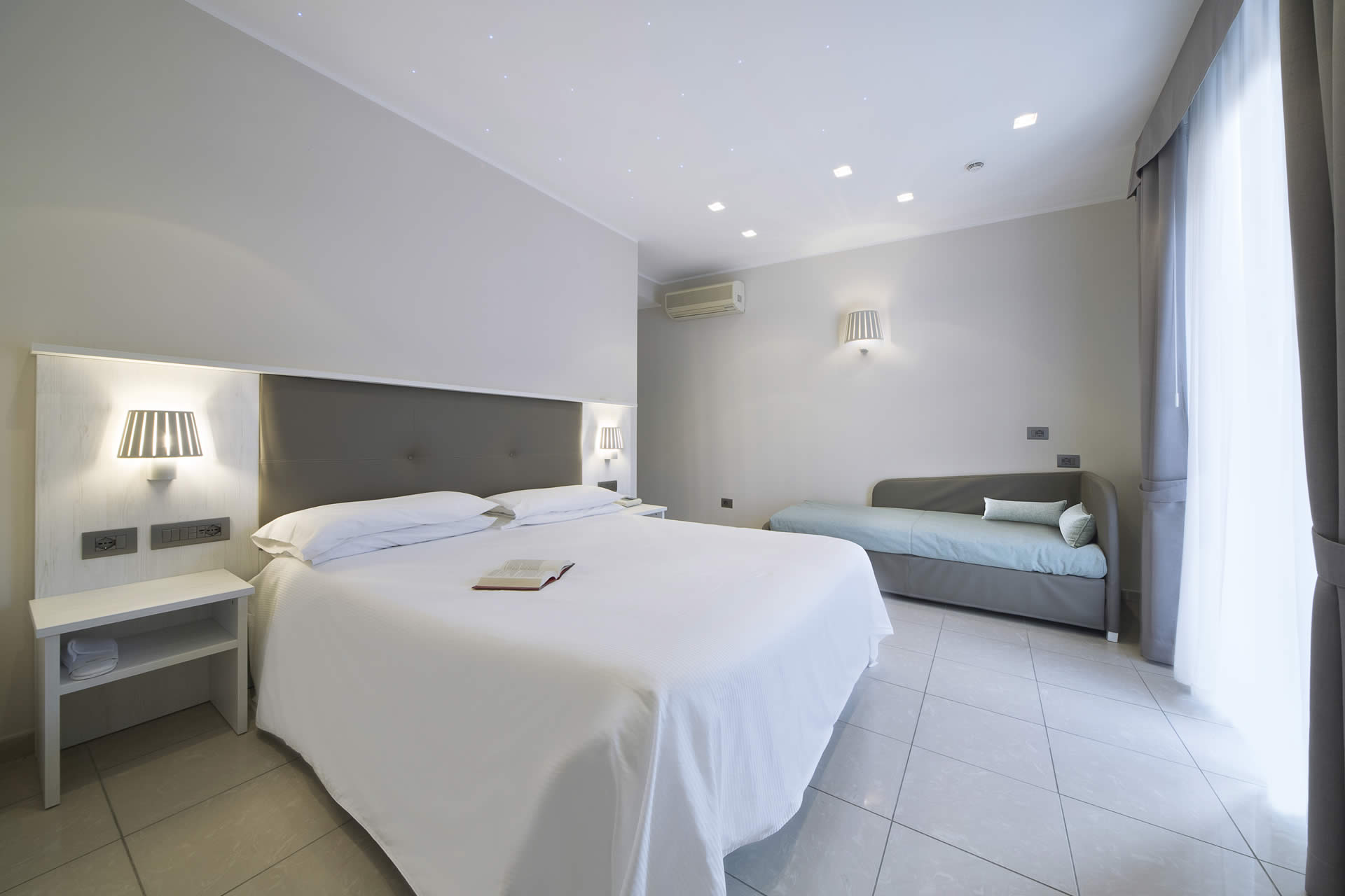 Servizi e comfort: aria condizionata autonomamente regolabile, termosifoni, ventilatore a soffitto, minifrigo, TV LCD/LED con canali satellitari e SKY, telefono, bagno con doccia, asciugacapelli, cassaforte, Internet ADSL/Wi-Fi gratuito.