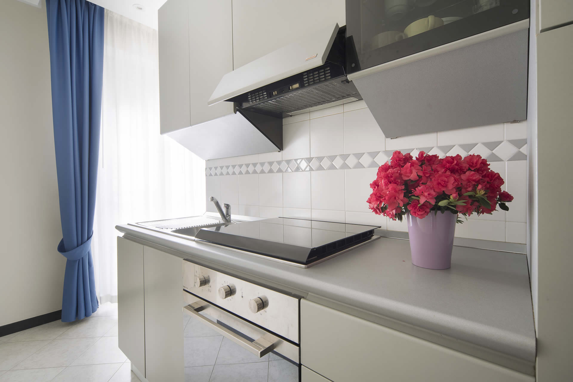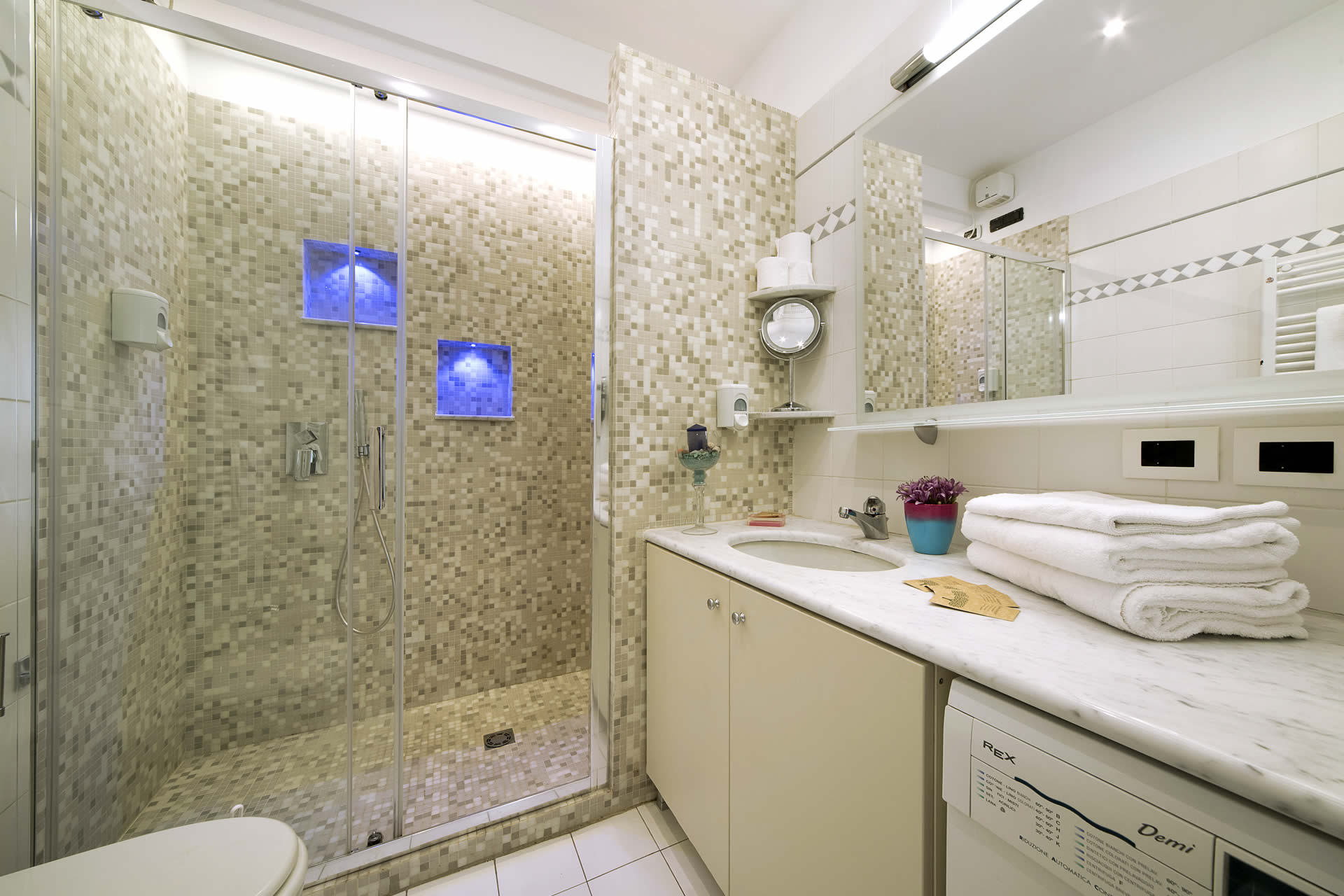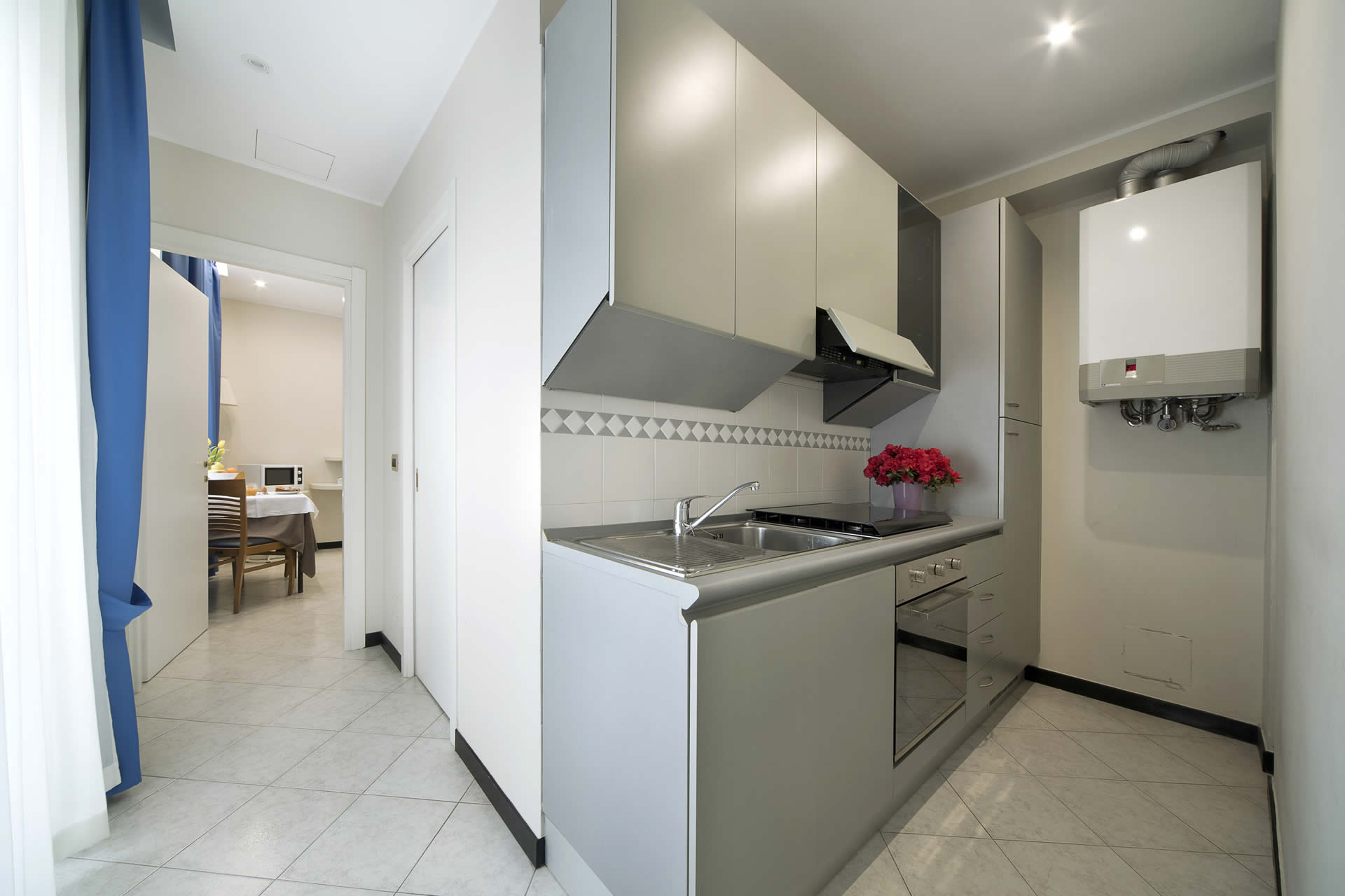 Bilocale con soggiorno con tv Led e divano in pelle con possibilità di trasformazione in letto matrimoniale e finestra, bagno con ampia doccia idromassaggio; balcone con angolo cottura e camera matrimoniale con la possibilità di aggiungere anche un terzo letto.
